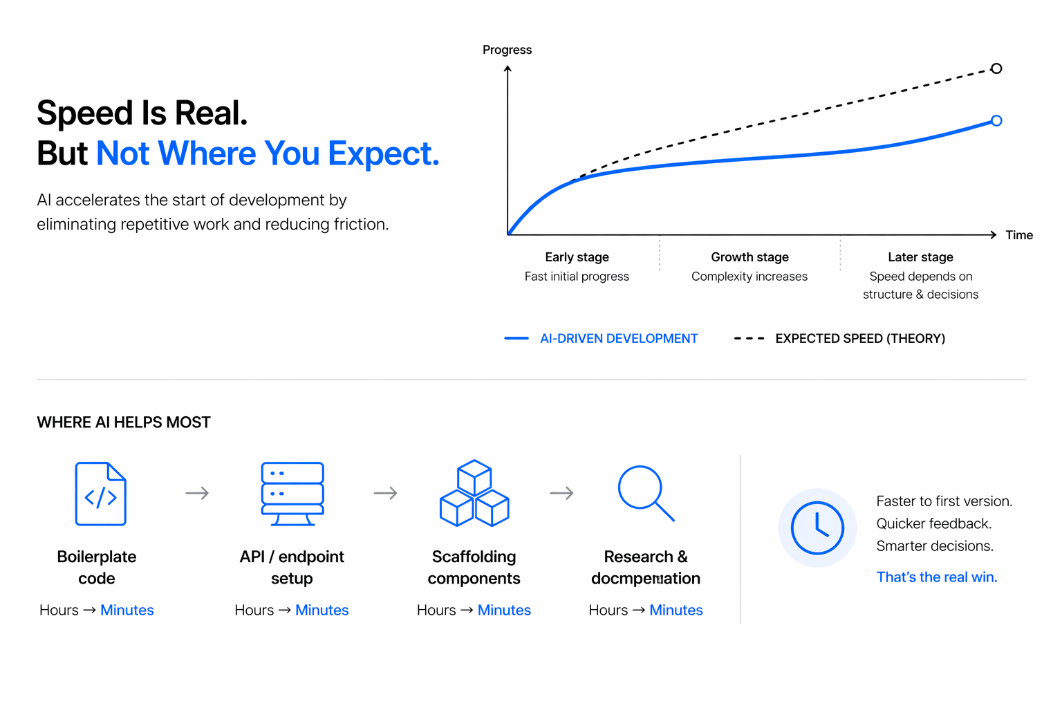 AI undeniably accelerates certain parts of development. The most obvious one is the elimination of repetitive work.